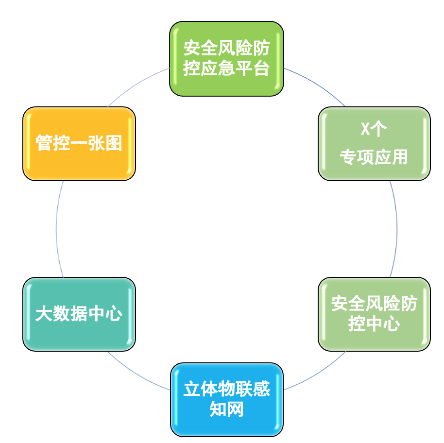智慧安全園區(qū)采用“五個一 +X個專項應用”的頂層設計模式,“五個一”包括:一個防控中心(安全風險防控中心)、一張物聯(lián)網(wǎng)(安全風險感知物聯(lián)網(wǎng))、一張管控圖(安全風險管控一張圖)、一個大數(shù)據(jù)中心(安全風險防控大數(shù)據(jù)中心)、一個應急平臺(統(tǒng)一應急平臺)?!癤個專項應用”包括三大類:園區(qū)周界安全專項(封閉園區(qū)管理等)、公共區(qū)域安全專項(管廊管線、氣體泄漏等)、企業(yè)安全專項(重大危險源專項、高風險企業(yè)專項、三廢監(jiān)測等)。
