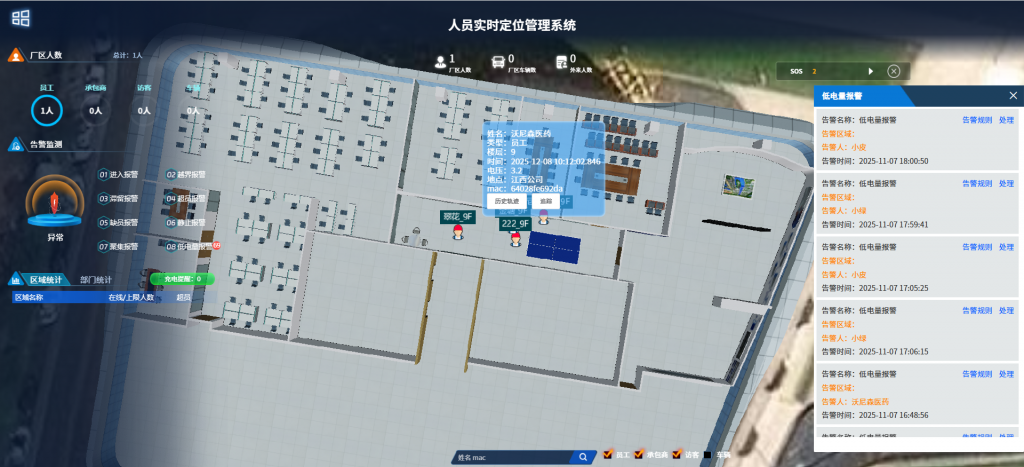 系統(tǒng)界面支持在平面地圖、地圖上直觀顯示現(xiàn)場人員位置,通過人員佩戴定位標(biāo)簽實(shí)時查看人員分布和在崗情況,且地圖支持縮放、分層、單擊建筑物等查看方式,點(diǎn)擊地圖中任一人員,顯示人員詳細(xì)信息。