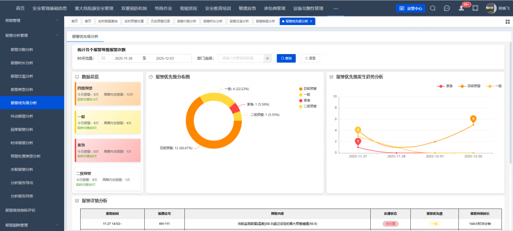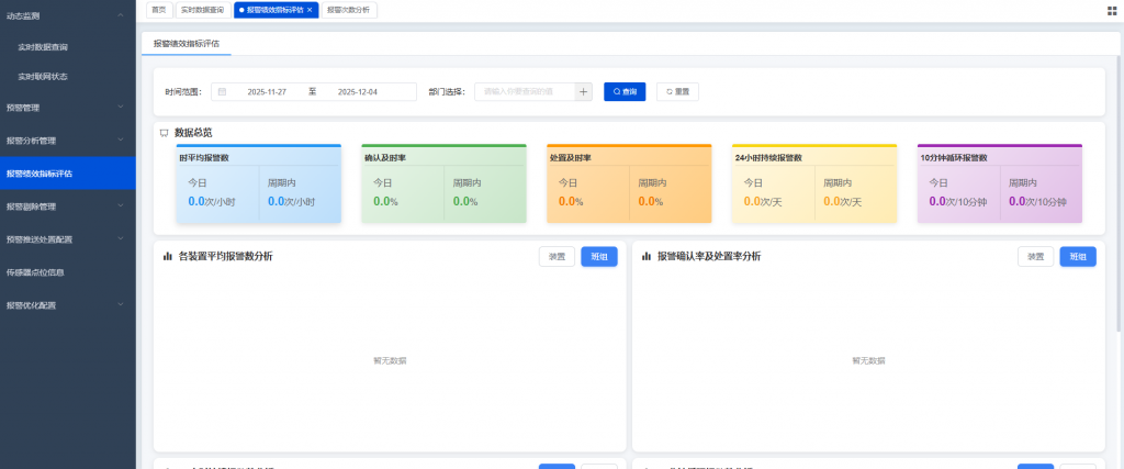 系統(tǒng)具備報警關鍵績效指標(KPI)績效指標評估功能,報警指標包括報警總數(shù)、報警狀態(tài)、級別分布等,反映企業(yè)報警管理及處置水平情況。