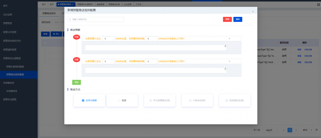 系統(tǒng)支持對報警處置及推送規(guī)則的自定義配置,報警未處置自動升級推送。根據(jù)企業(yè)實際情況配置報警升級內容及接收人,可現(xiàn)在應用內彈窗及短信兩種推送方式。實現(xiàn)報警的及時處置。