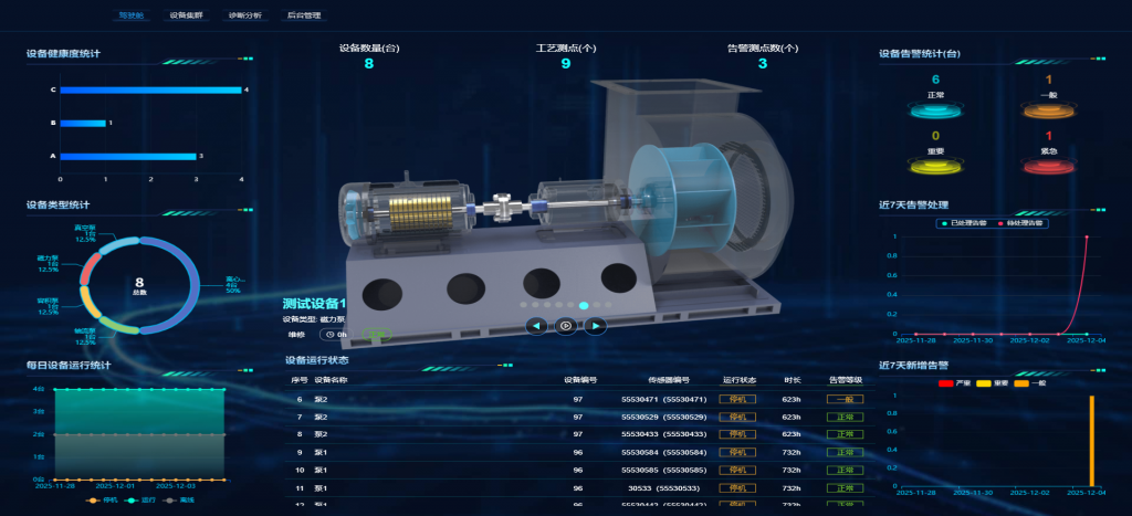 系統(tǒng)基于先進(jìn)的預(yù)測(cè)性維修與故障診斷技術(shù)、可靠性評(píng)估與預(yù)測(cè)算法,對(duì)設(shè)備狀態(tài)進(jìn)行綜合評(píng)估,生成狀態(tài)評(píng)分及診斷結(jié)論,并清晰呈現(xiàn)于大屏。