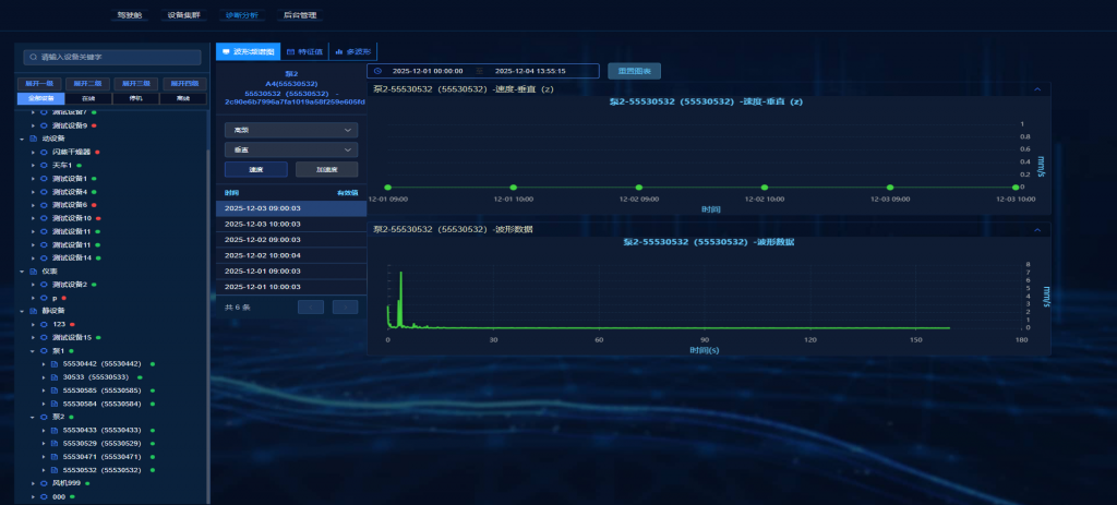 系統(tǒng)集中管理展示機(jī)泵多點(diǎn)位溫振數(shù)據(jù)(含多種特征值、時(shí)域譜、頻域譜、溫度等)、支持接入設(shè)備工藝數(shù)據(jù),通過數(shù)據(jù)的聯(lián)合分析、數(shù)據(jù)處理、歷史查詢等功能。實(shí)現(xiàn)設(shè)備相關(guān)數(shù)據(jù)的采集,記錄設(shè)備產(chǎn)生的故障模式及其對(duì)安全生產(chǎn)造成的影響,并按照故障模式的嚴(yán)重程度提出警示及相應(yīng)處置措施。系統(tǒng)集中管理展示機(jī)泵多點(diǎn)位溫振數(shù)據(jù)(含多種特征值、時(shí)域譜、頻域譜等)、支持相關(guān)工藝指標(biāo)(機(jī)泵進(jìn)出口壓力、流量等)數(shù)據(jù)及其變化趨勢(shì),具備數(shù)據(jù)的聯(lián)合分析、數(shù)據(jù)處理、歷史查詢等功能。
