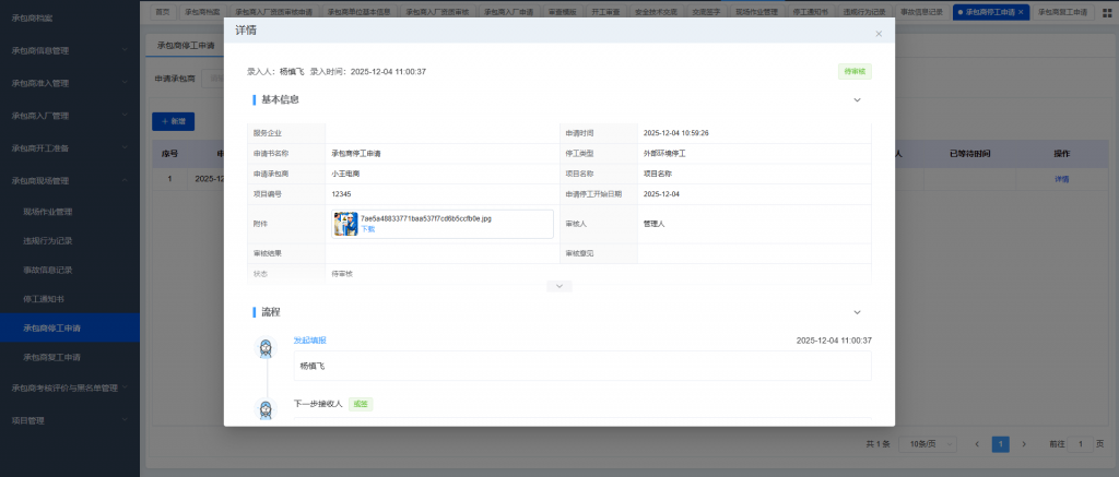 企業(yè)可在線上發(fā)停工指令到承包商負(fù)責(zé)人員,復(fù)工申請(qǐng)時(shí)必須提供停工原因以及整改情況,后有企業(yè)審核是否通過(guò)。