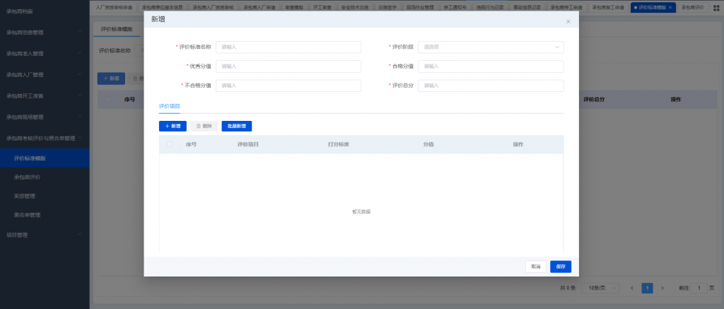 自定義承包商評(píng)價(jià)標(biāo)準(zhǔn)模板,項(xiàng)目驗(yàn)收后對(duì)承包商單位人員工作能力、管理水平與作業(yè)完成效果的進(jìn)行評(píng)定,根據(jù)安全業(yè)績(jī)?cè)u(píng)價(jià),生成評(píng)估模型,直觀的了解評(píng)價(jià)情況。