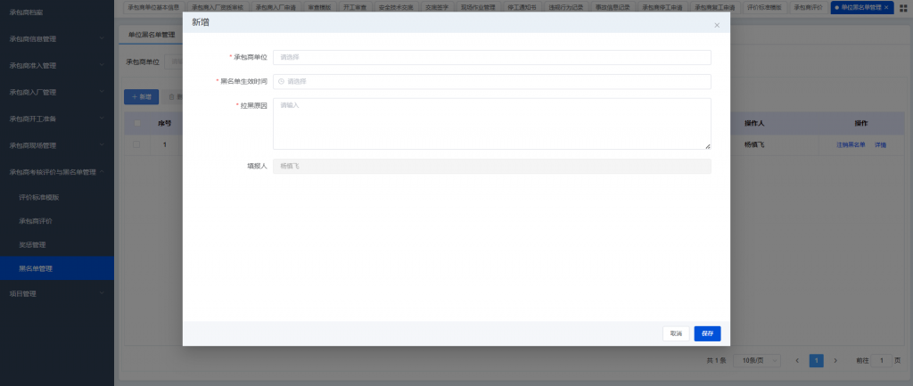 黑名單管理功能模塊記錄和管理承包商的黑名單信息,可在系統(tǒng)中登記標(biāo)注黑名單企業(yè)。被標(biāo)注為黑名單的企業(yè)將無(wú)法發(fā)起入廠申請(qǐng),系統(tǒng)將自動(dòng)過(guò)濾黑名單的數(shù)據(jù),幫助企業(yè)對(duì)承包商進(jìn)行誠(chéng)信管理。