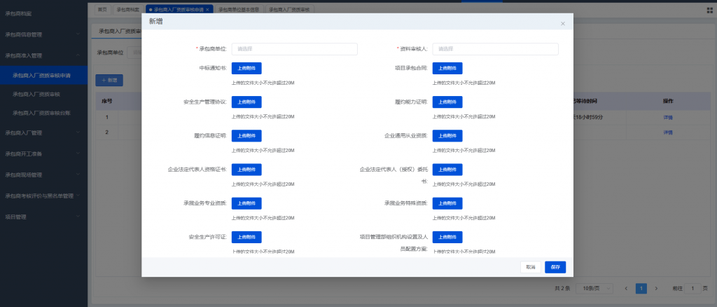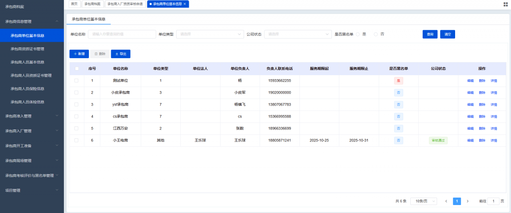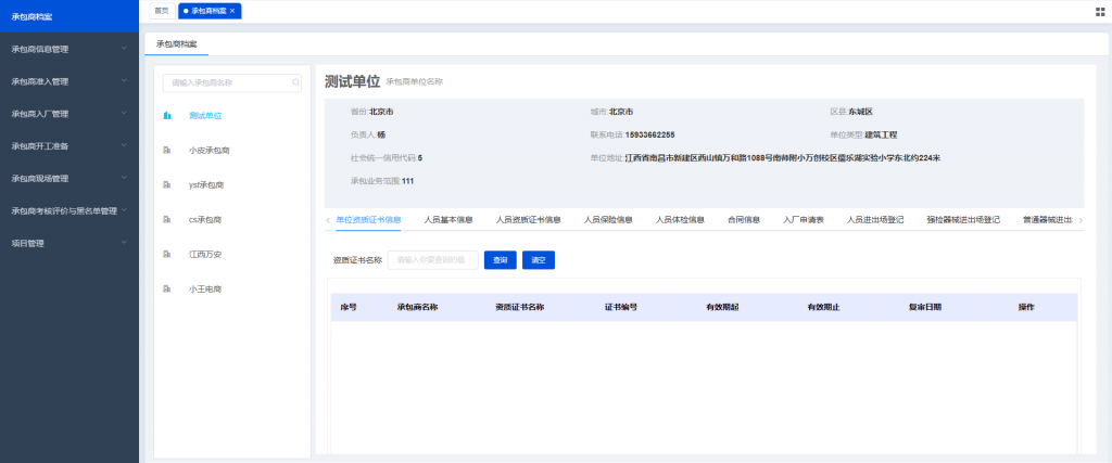 提供承包商檔案的全面管理,系統(tǒng)自動(dòng)建立承包商詳細(xì)的檔案,自動(dòng)歸檔承包商的在系統(tǒng)中的所有信息包括基本信息、資質(zhì)證明、施工經(jīng)驗(yàn)、業(yè)績(jī)?cè)u(píng)估等。支持承包商拉入黑名單操作以及承包商評(píng)價(jià)操作,可通過(guò)左側(cè)檔案列表,用戶可便捷切換不同承包商信息,實(shí)現(xiàn)高效查詢與數(shù)據(jù)維護(hù),確保檔案信息的完整性與準(zhǔn)確性。