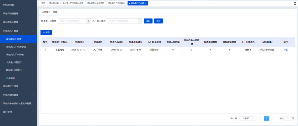 僅當(dāng)承包商已通過(guò)入廠資質(zhì)審核,且未被系統(tǒng)標(biāo)記為黑名單時(shí),方可發(fā)起入廠申請(qǐng);對(duì)于不符合條件的承包商,系統(tǒng)將自動(dòng)過(guò)濾。入廠可包括人員入廠、強(qiáng)檢器械入廠、普通器械入廠等數(shù)據(jù)匯合發(fā)起一次入廠申請(qǐng),用戶可輸入承包商名稱和施工項(xiàng)目可進(jìn)行信息查詢。